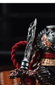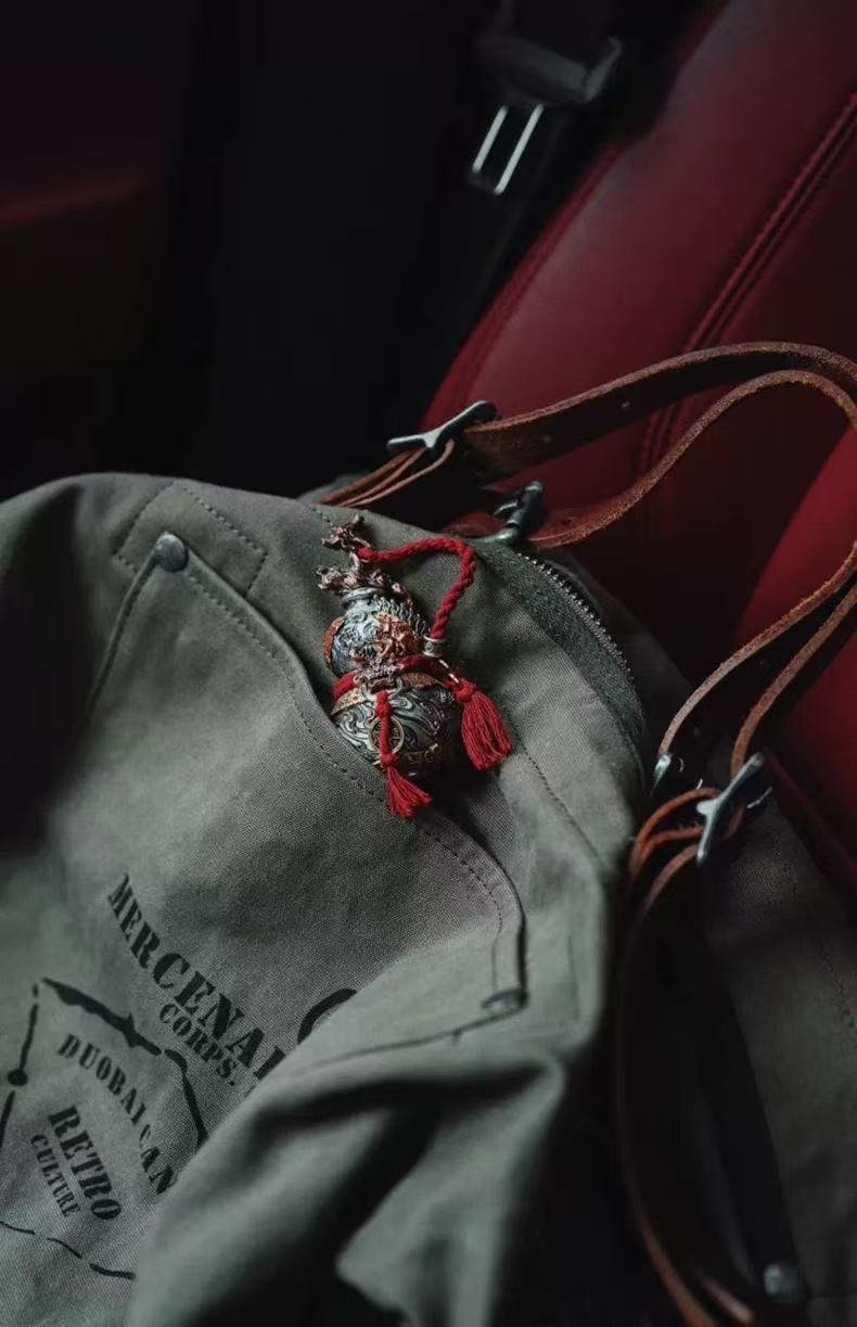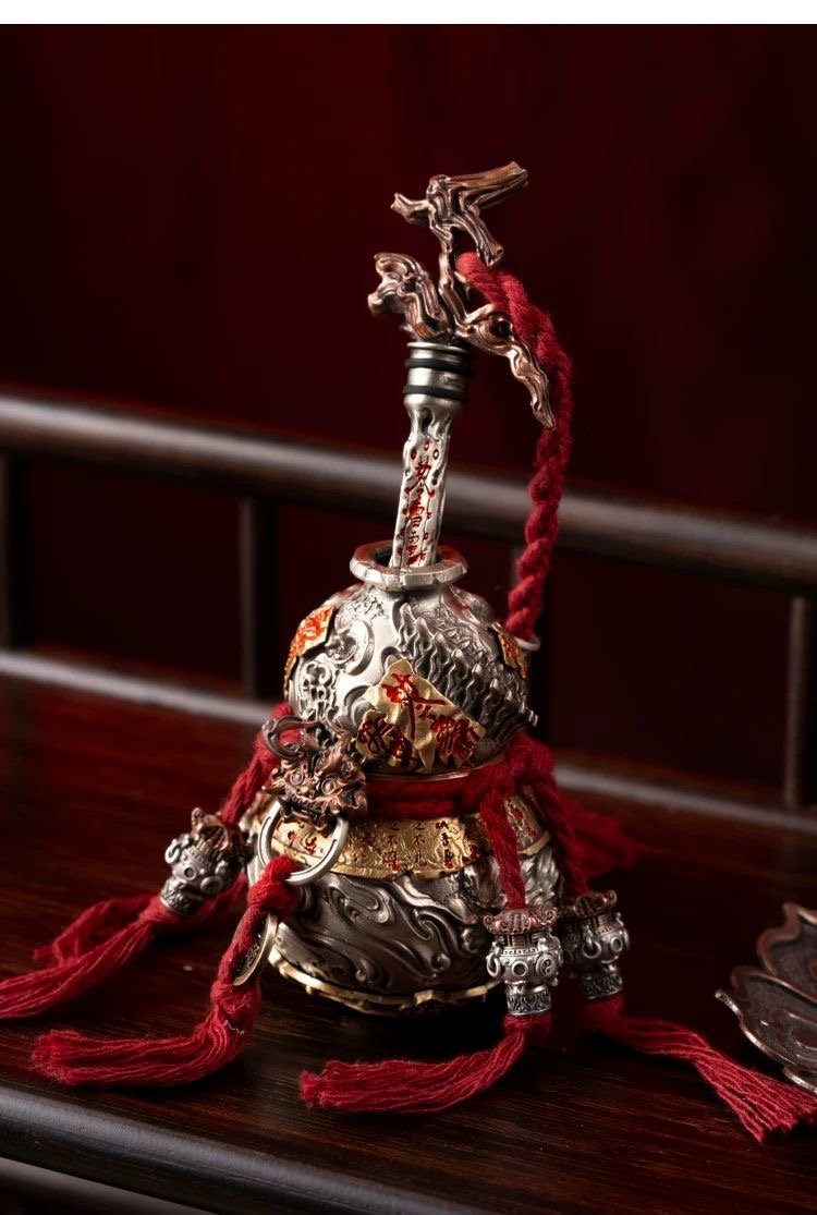 在古代东方传说中,铸剑师们为了锻造神剑而费尽心思,却为了压制剑中不羁的剑灵而闹事。有一天,他看到葫芦藤缠绕在库珀身上,月光下出现了神秘的光环,灵感就出现了。以铜为材料,塑料葫芦形器引入剑灵,并在葫芦上雕刻山河纹和吉祥符号,使其与葫芦共存。从此,这件青铜剑葫芦承载着“护航精神、藏吉祥”的寓意,传承了工匠的坚守和东方神秘文化,成为了独一无二的工艺珍品。